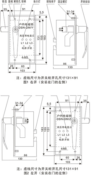 注:所謂左側(cè)安裝或右側(cè)安裝,系指操作者面向鎖定對(duì)象(如操作桿,柜體固定部分),所對(duì)應(yīng)的安裝位置。當(dāng)電磁鎖在鎖定對(duì)象上的安裝位置,位于操作者面向的左側(cè)時(shí)即為左側(cè)安裝,反之,即為右側(cè)安裝。
