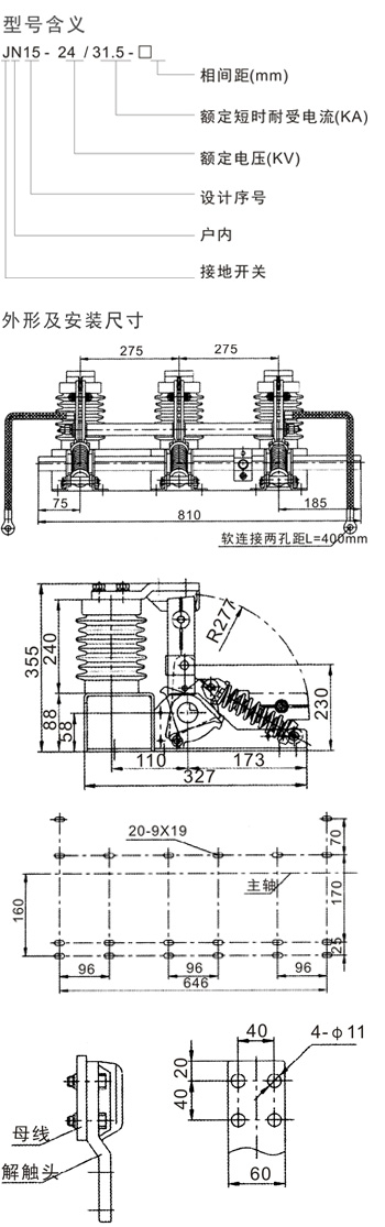 JN15-24/31.5型系列戶內(nèi)高壓接地開關(guān)是我公司最新開發(fā)的新型接地開關(guān)。該產(chǎn)品具有設(shè)計(jì)先進(jìn)、結(jié)構(gòu)簡(jiǎn)單緊湊、技術(shù)性能可靠等特點(diǎn),符合GB1985-2004《交流高壓隔離開關(guān)和接地開關(guān)》及IEC62271-102:2002的要求,適用于戶內(nèi)24KV三相交流50(60)Hz的電力系統(tǒng)中;它具有短路關(guān)合能力以保護(hù)開關(guān)設(shè)備內(nèi)其它電氣設(shè)備不受損壞,可與各種高壓開關(guān)柜配套使用,作為高壓電器設(shè)備檢修時(shí)的接地保護(hù)。