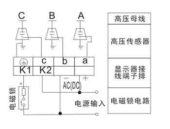 DXN(GSN)系列戶內高壓帶電顯示裝置由三個傳感器和一個顯示器經(jīng)導線連接組成。適用于額定頻率50Hz,額定電壓40.5kV以下的戶內高壓電氣設備上,既可反映回路帶電狀況,還可與電磁鎖配合,實現(xiàn)強制閉鎖開關手柄、閥門等。帶電顯示和強制閉鎖均受同一高壓信號所控制,但電路系統(tǒng)又是相互獨立、互不干擾,只要高壓回路帶電,即使顯示電路和閉鎖電路同時出故障,電磁鎖仍處于閉鎖狀態(tài),達到防止誤操作,誤入帶電間隔。